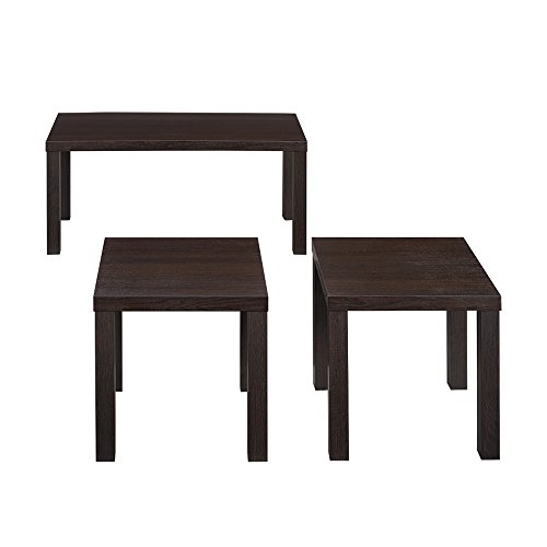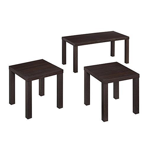 Description: Complete your living room or home office with this beautiful, 3-pack coffee table set. Includes two side tables and coffee table to give your home the stylish storage space it needs and tie the whole room together. Constructed from high-grade MDF for a long lasting design finished with a durable laminate what will fit any home décor. Features: • Stylish, sturdy design • High-grade MDF with durable laminate • Includes two side tables and one coffee table • Open shelves provide lots of storage space • Ships ready-to-assemble with step-by-step instructions Coffee Table dimensions: 18" W x 24" D x 18" H Weight: 19 lbs. Side Table dimensions: 24" W x 24" D x 18" H Weight: 15 lbs.High-grade MDF with durable laminateIncludes two side tables and one coffee table